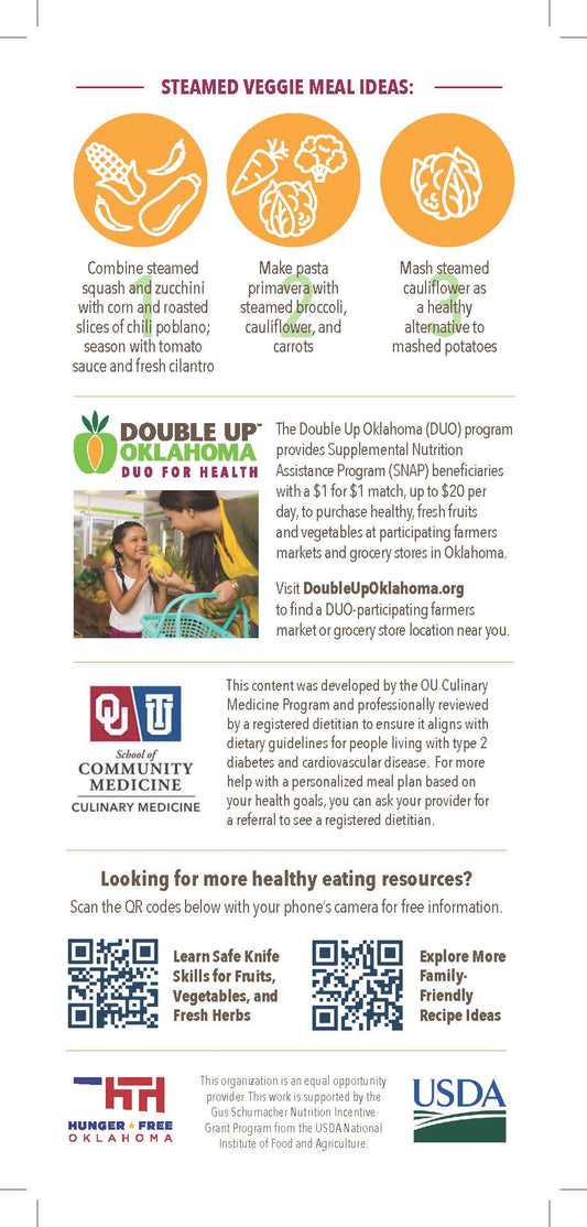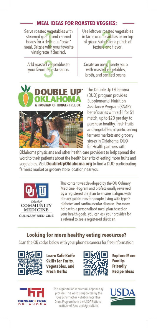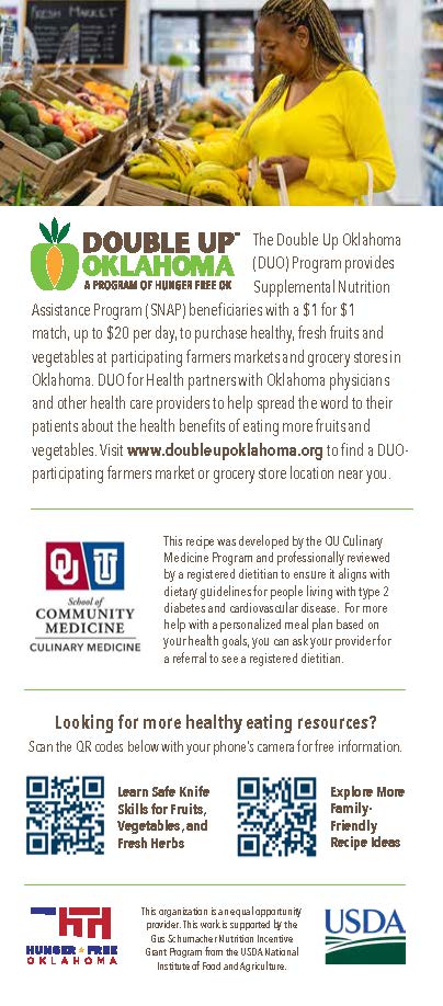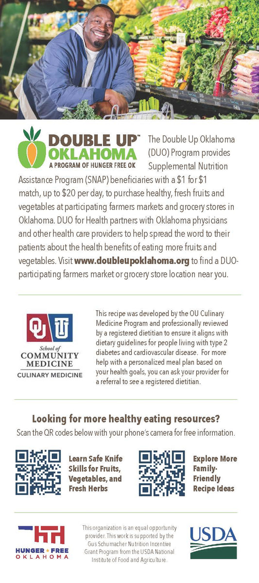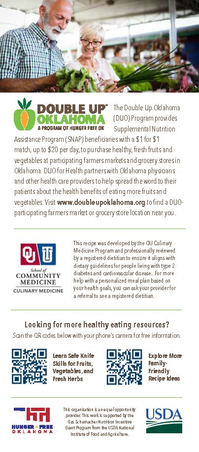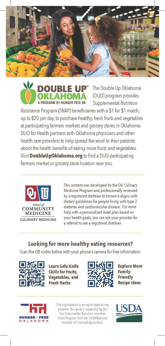 DUO for Health provides eligible physicians, nurse practitioners, and physician assistants with free patient education materials about the effective use of fruits and vegetables for glycemic and blood pressure control. All materials have been designed by a registered dietitian and reviewed by faculty experts at the University of Oklahoma Hudson College of Public Health and the OU-TU School of Community Medicine Culinary Medicine program.