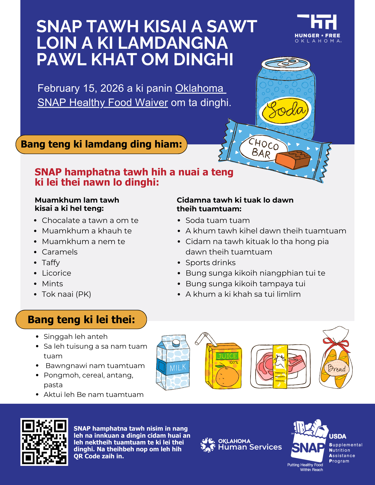 The Healthy Food Waiver goes into effect February 15, 2026. This flyer includes information about items that are no longer eligible, what is still eligible, and a QR code that links to OKDHS’ website with more information.